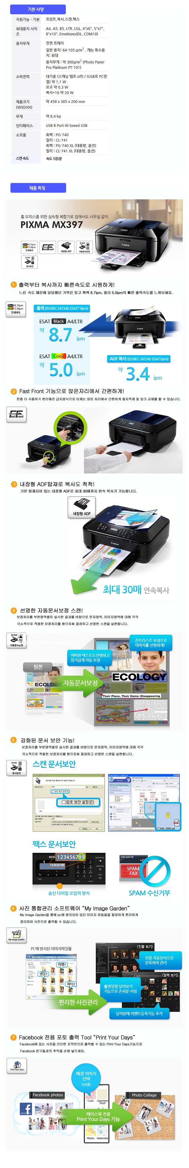 CANON PIXMA MX397  : 스캔 복사 팩스 양면인쇄(수동) 컬러,흑백 인쇄 /USB B Port H