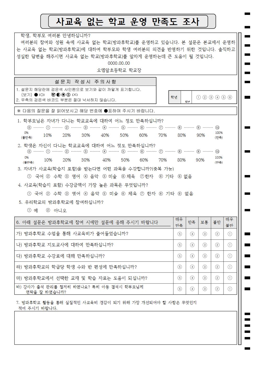 사교육 없는 학교 운영 만족도 조사  : A4/단면/6문항/2~10지선다
