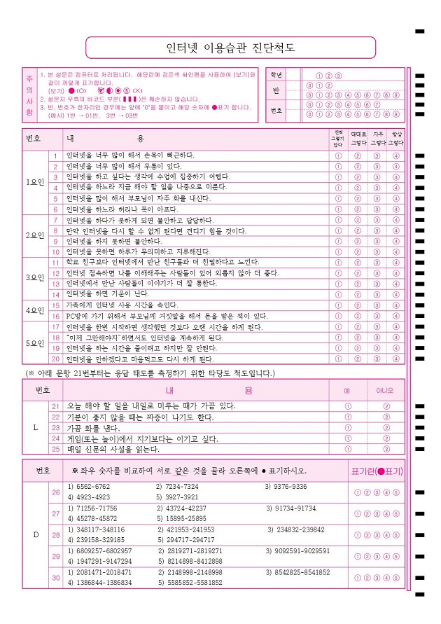 인터넷 이용습관 진단척도  : A4/단면/30문항/2~5지선다