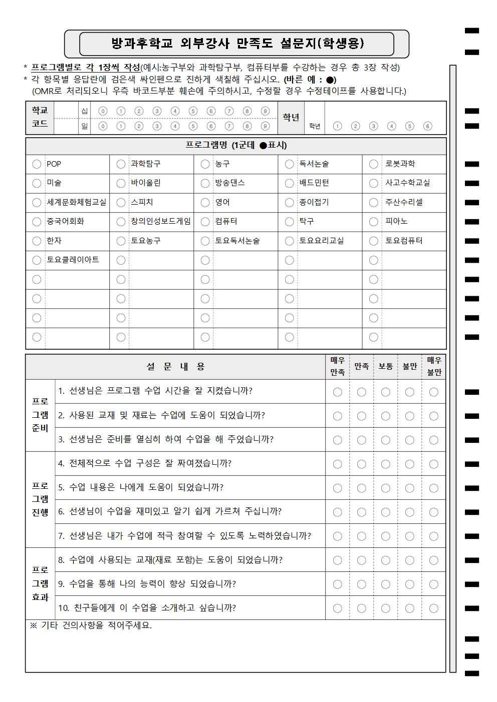 방과후학교 외부강사 만족도 설문지(학생용)  : A4 /단면 /10문항 / 5지선다