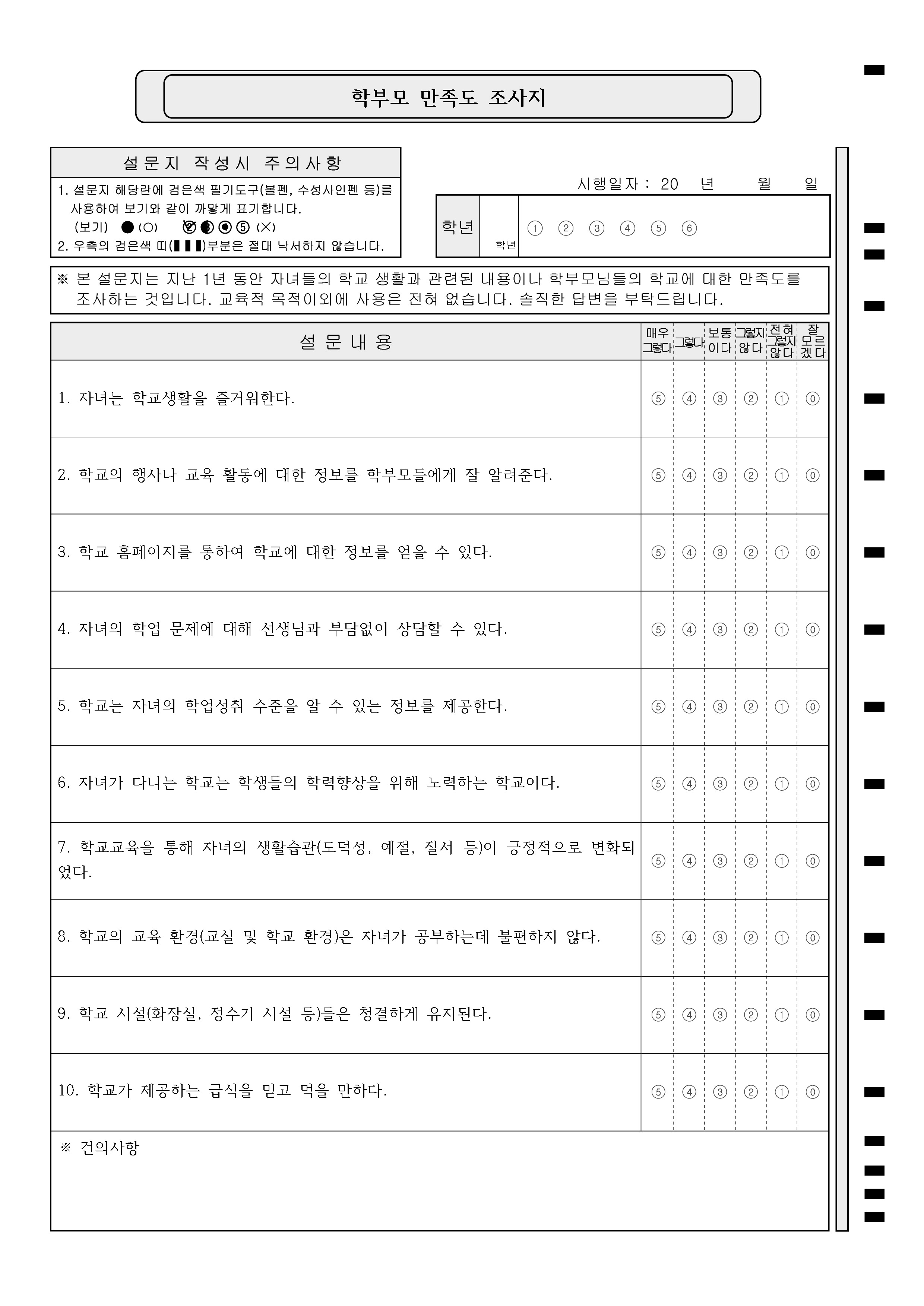 학부모 만족도 조사  : A4/단면/10문항/5지 선다