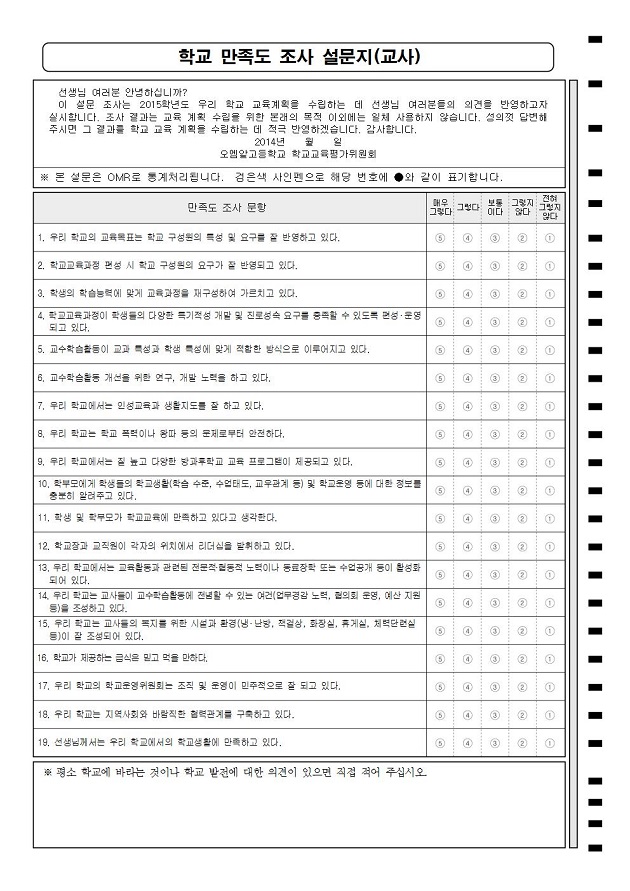 학교 만족도 조사 설문(교사용)  : A4/단면/19문항/5지선다