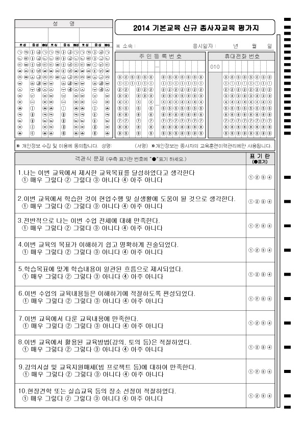 신규 종사자교육 설문  : A4/단면/10문항/4지선다