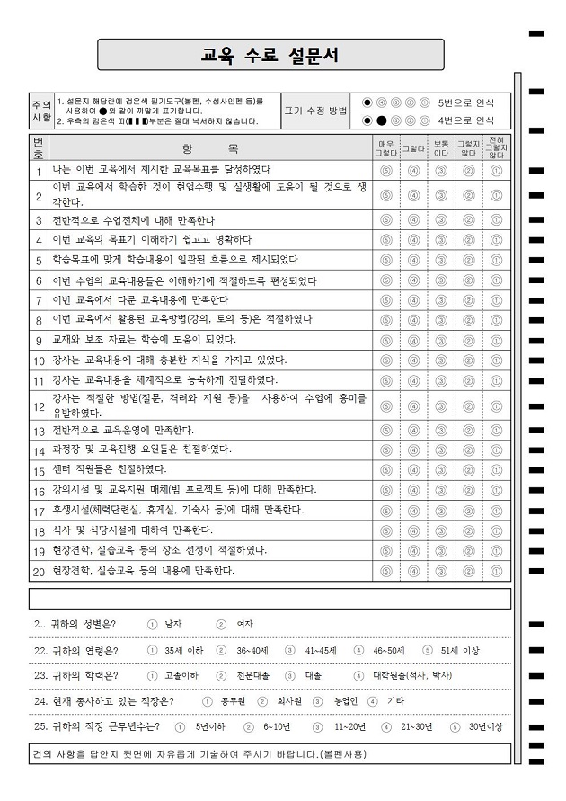 교육 수료 설문(일반)  : A4/단면/25문항/2~5지선다