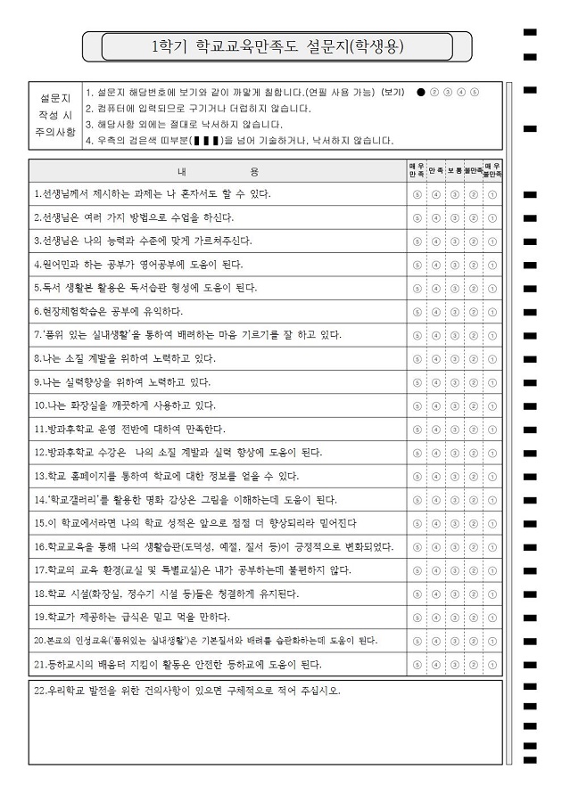 학교교육만족도 설문2(학생용)  : A4/단면/22문항/5지선다