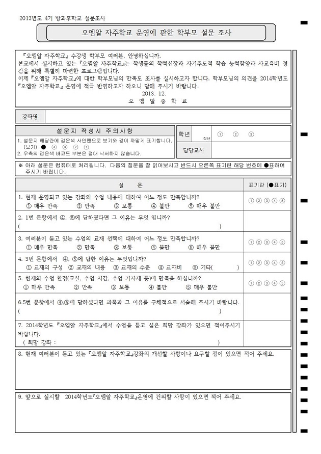 자주학교 운영에 관한 학부모 설문조사  : A4/단면/9문항(서술형6문항포함)/5지선다