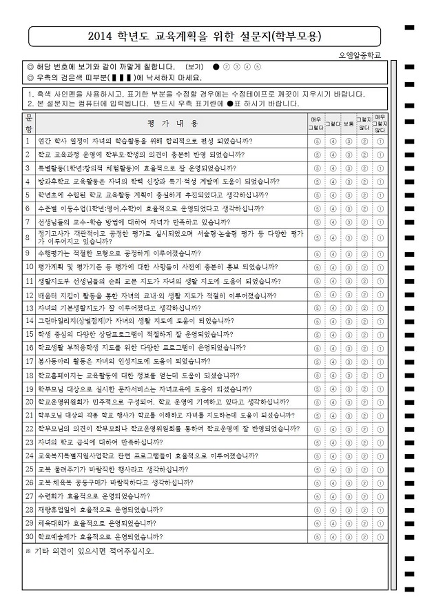 교육계획을 위한 설문(학부모용)  : A4/단면/31문항(서술형1문항포함)/5지선다
