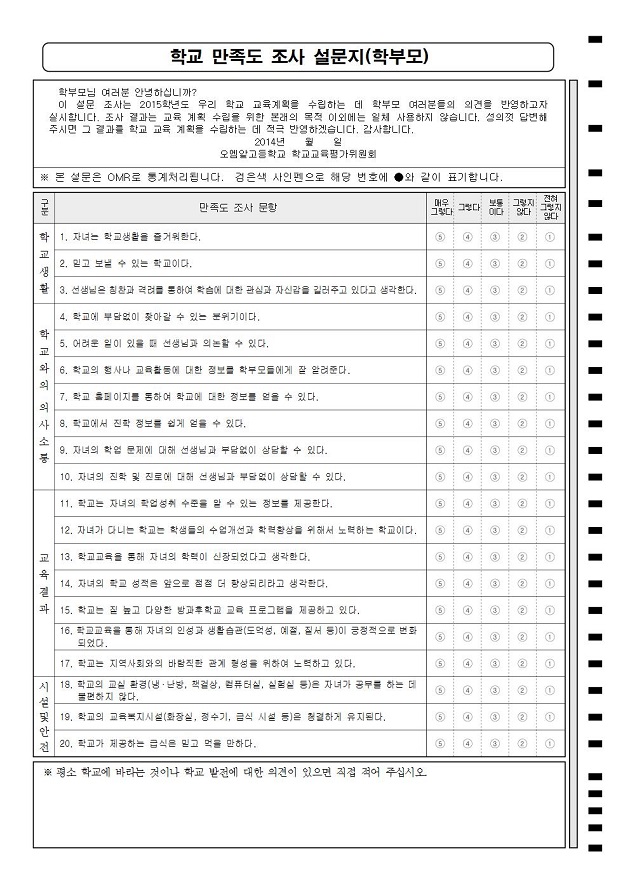 학교 만족도 조사 설문(학부모용)  : A4/단면/20문항/5지선다