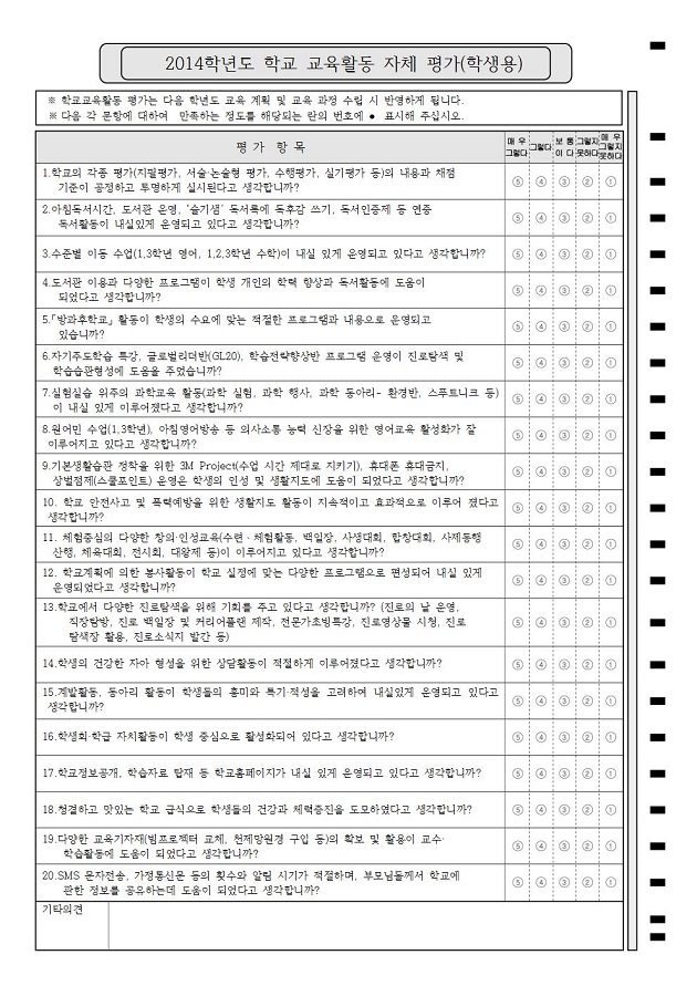 학교교육활동 자체평가(학생용)  : A4/단면/20문항/5지선다
