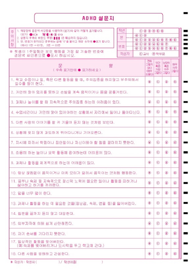 ADHD(과잉행동장애 검사)  : A4/단면/18문항/4지선다