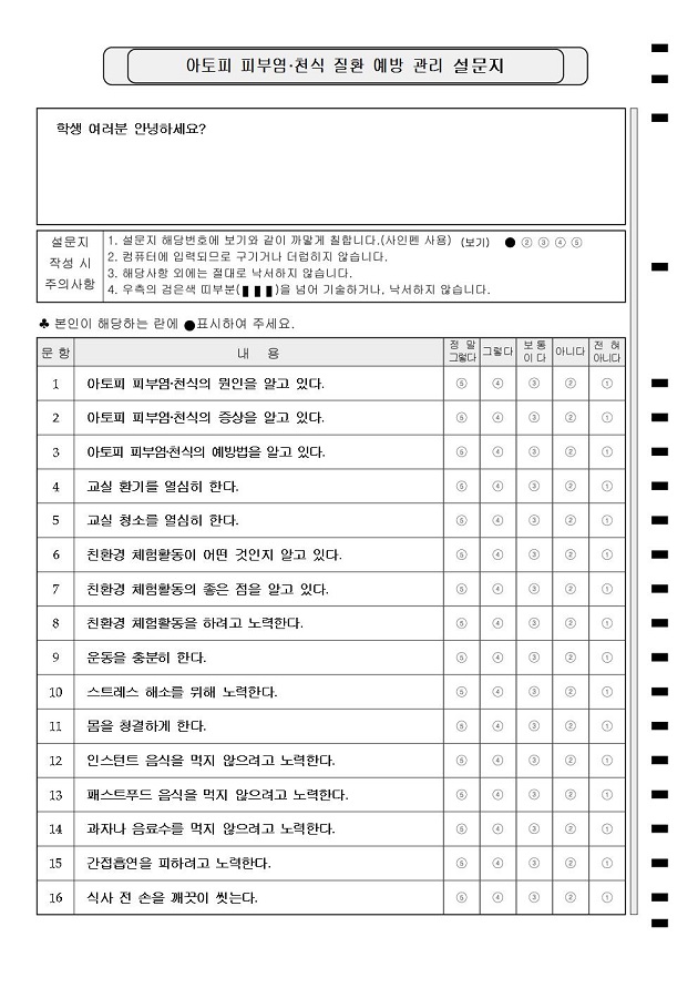 아토피 피부염·천식질환 예방관리 설문(학생용)  : A4/단면/5지선다/16문항