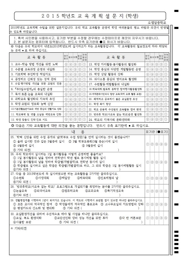 교육계획 설문(학생용)  : A4/단면/총30문항/5지선다