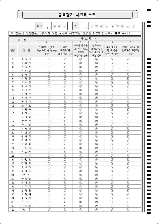 동료평가 체크리스트  : A4/단면/동료40명기재/6지선다