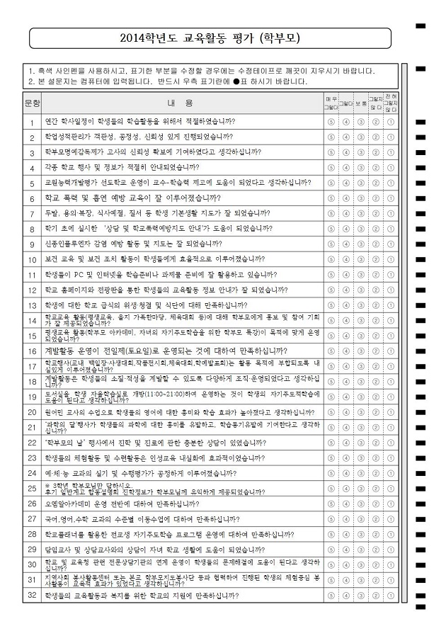 교육활동평가2(학부모용)  : A4/단면/31문항/5지선다