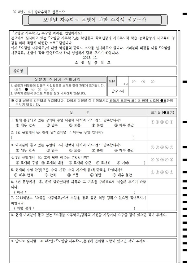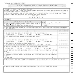 자주학교 운영에 관한 수강생 설문조사  : A4/단면/9문항(서술형5문항포함)/5지선다