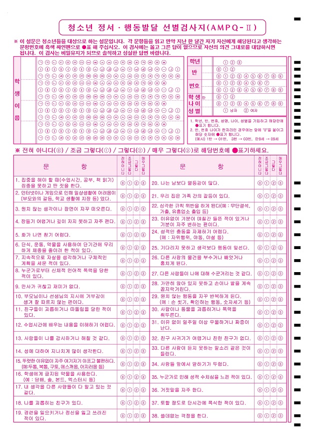AMPQ2(정신건강검사)-남자중학생용  : A4/단면/38문항/4지선다